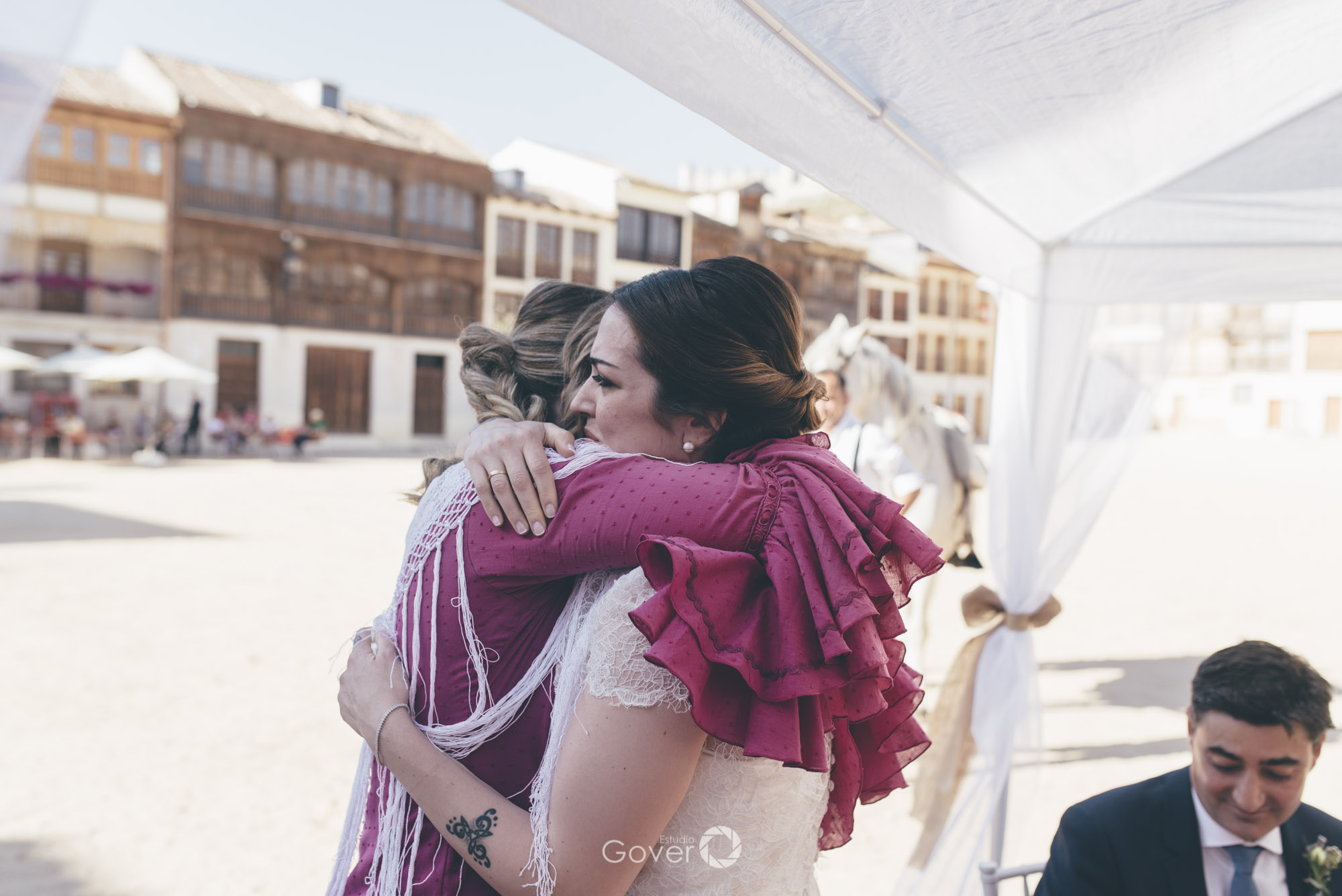 La ceremonia iba a ser especial, era la primera vez que se celebraba una boda en la plaza del coso de Peñafiel. Un entorno maravilloso para la celebración de la boda. La única pega eran los casi 40 grados de calor que teníamos, pero ningún inconveniente para que la celebración fuera un éxito. Una ceremonia cargada de emociones y sorpresas continuamente. El ceremoniante intentó mantener un tono distendido e incluso humorístico para intentar realizar una ceremonia amena y divertida.
